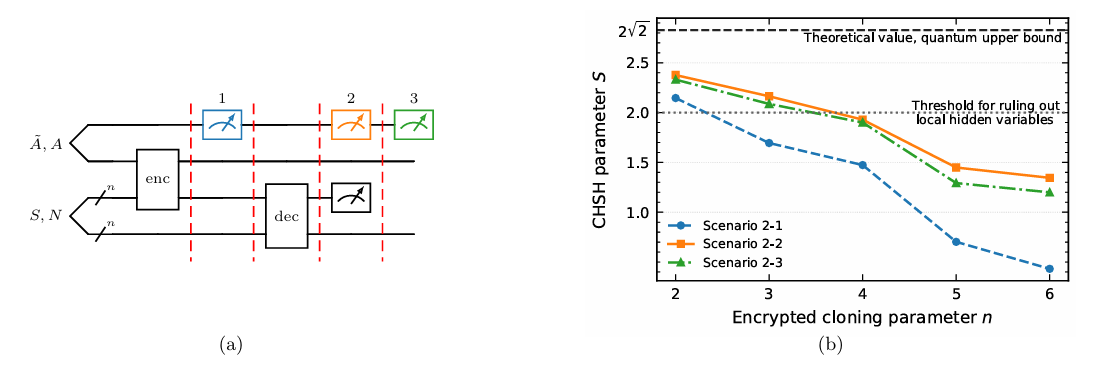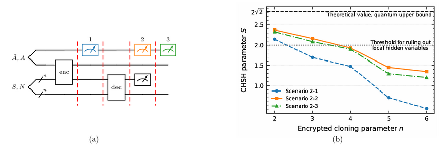 Особый интерес представляет второй эксперимент команды, который затрагивает фундаментальные вопросы квантовой нелокальности. Если оригинальный кубит А запутан с кубитом-анциллой B, то после процедуры клонирования кубита А анцилла B оказывается запутана не с конкретной частицей, а с глобальной системой клонов и ключа.