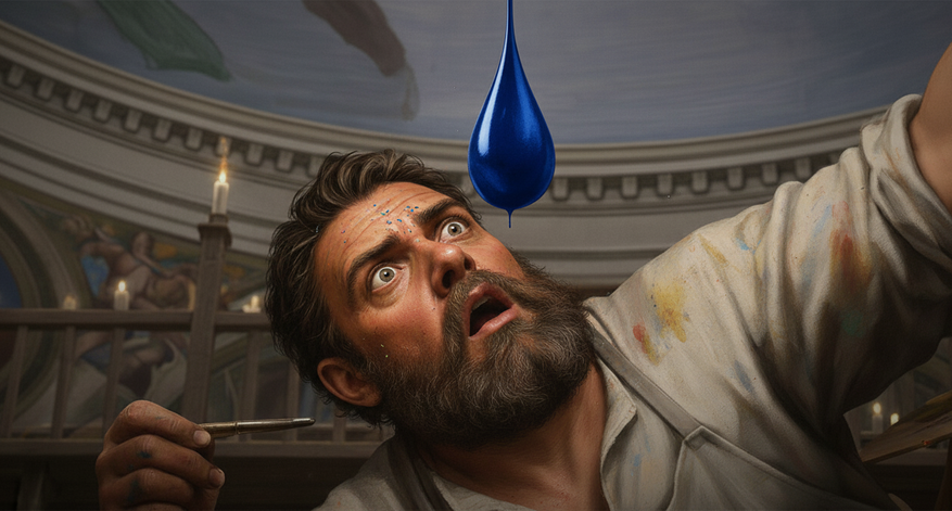 В 1511 году, создавая фреску «Сотворение Адама» на своде Сикстинской капеллы, Микеланджело Буонарроти столкнулся с физической проблемой. Работая на лесах, художник был вынужден наносить пигмент на горизонтальную поверхность прямо над собой. Как отмечают историки, поведение жидкости на потолке стало одной из главных причин серьезных задержек в работе мастера. Слой жидкой краски, нанесенный на нижнюю плоскость перекрытия, нестабилен. Под воздействием гравитации он быстро теряет равномерную толщину, масса стягивается в локальные утолщения и неизбежно срывается вниз в виде капель, уничтожая уже проделанную работу и заливая лицо и глаза.