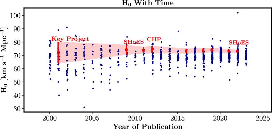 Команда Венди Фридман, используя объединенные данные «Хаббла» и свежие, кристально чистые наблюдения «Уэбба», провела перекалибровку «стандартных свечей». И что же? Их новое значение постоянной Хаббла составило 70,4 км/с на мегапарсек (+-3%).