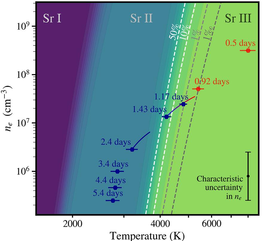 Исследование принесло ключевой результат: измерение температуры плазмы, образовавшейся после столкновения нейтронных звезд. В начальной фазе температура плазмы достигает величины порядка миллиардов градусов Цельсия, что в 10³ раз превосходит температуру солнечного ядра и соответствует условиям Вселенной в течение долей секунды после Большого Взрыва. Высокая энергия среды приводит к полной ионизации атомов, формируя плазму, в которой электроны не находятся в связанном состоянии с атомными ядрами. С понижением температуры плазмы происходит рекомбинация электронов с атомными ядрами, приводящая к образованию нейтральных атомов, аналогично процессу рекомбинации в ранней Вселенной.