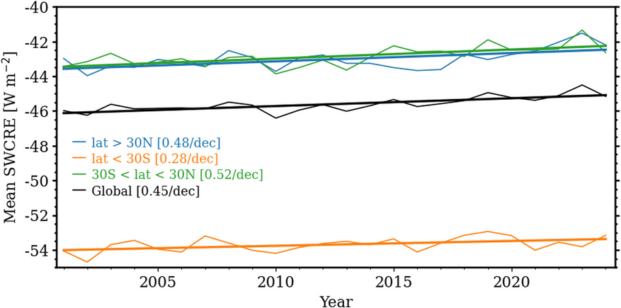 В чём же дело? Причина не в том, что облака просто «растворяются». Они смещаются. Хорошо известные последствия глобального потепления — такие как изменение глобальных ветров (атмосферной циркуляции) и расширение жарких тропических зон — буквально вытесняют облачные системы из их привычных мест. Штормовые фронты всё чаще смещаются к полюсам, оставляя умеренные широты под более ясным, но и более палящим небом.