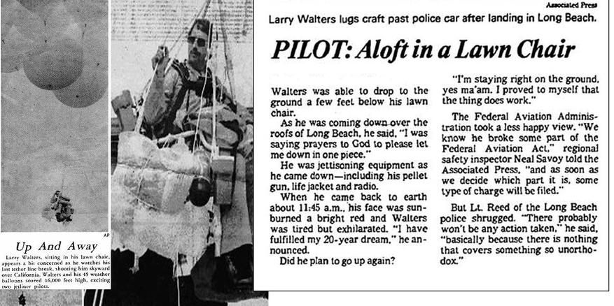 Ларри Волтерс, известный как «Летчик на садовом кресле», стал символом стремления к мечте. Его необычный полет в 1982 году привлек внимание многих жителей США.