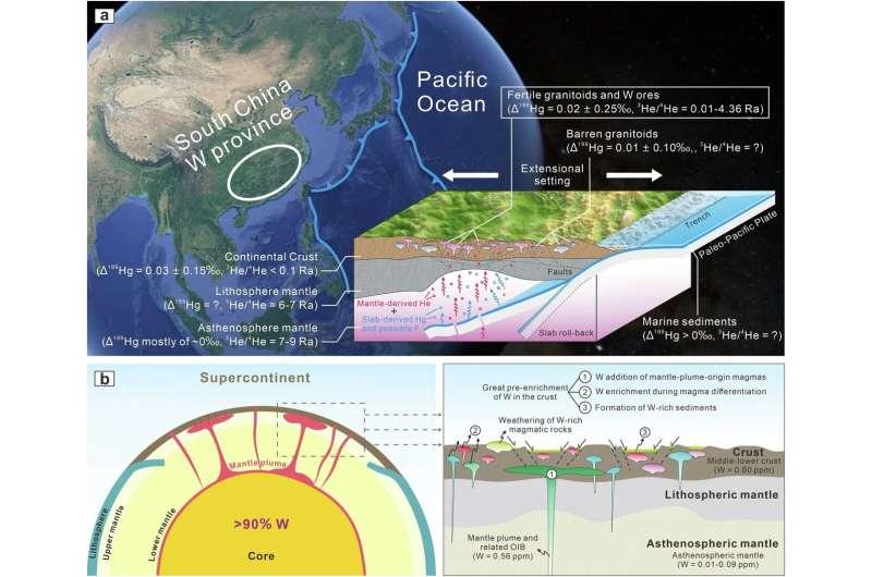 Феномен Южного Китая, обладающего колоссальными запасами вольфрама, объясняется уникальным сочетанием двух факторов: наличием древнего предобогащённого субстрата (фрагмента внутренней части Нуны) и интенсивным взаимодействием коры с мантией в мезозойскую эру под влиянием субдукционных процессов Палео-Тихоокеанской плиты.