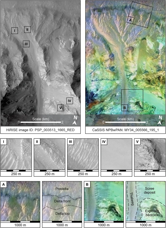 Это дало возможность применить метод «source-to-sink» (от источника к стоку), прослеживая путь осадочного материала от зоны эрозии на вершине хребта до места аккумуляции. Ученые смогли увидеть не только сами дельты, но и следы от эрозии на скалах выше по течению, откуда был изъят материал, сложивший эти структуры.