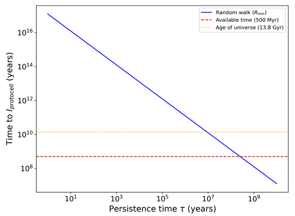 Автор моделирует этот процесс как «случайное движение в пространстве данных». И здесь цифры становятся другими. Если у процесса нет памяти или цели — то есть стабильности, чтобы сохранять результат, — то время для случайного создания клетки возрастает до гигантских значений. Это 1017 лет или больше. Это в миллионы раз дольше, чем существует Вселенная.
