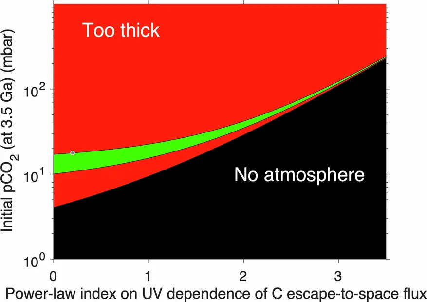 А теперь вернёмся на Марс. У него тоже был углекислый газ, и он тоже мог согревать планету. Когда Солнце становилось ярче и на поверхности появлялась жидкая вода, запускался тот же процесс, что и на Земле: вода вступала в реакцию с породами и начинала активно вытягивать CO₂ из атмосферы, запирая его в карбонатах. Атмосфера истончалась, парниковый эффект слабел, и Марс неумолимо замерзал, снова превращаясь в пустыню.
