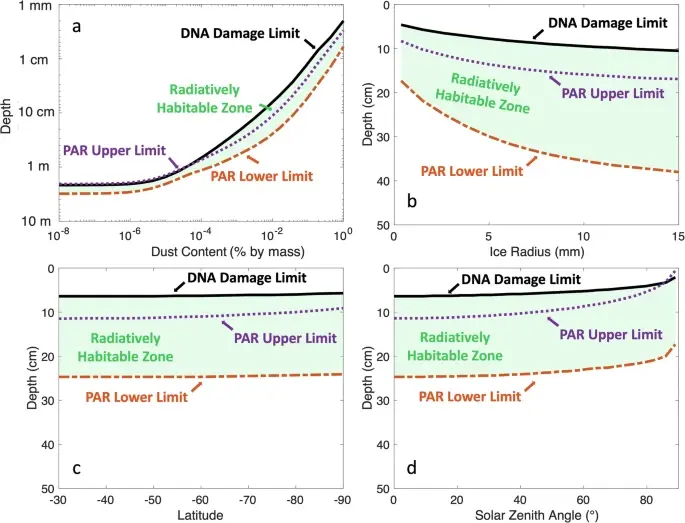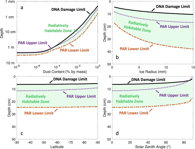 Исследователи предполагают, что подобные процессы могут происходить и на Марсе. Результаты компьютерного моделирования показывают, что даже на глубине до 3 метров под поверхностью льда интенсивность солнечного излучения может быть достаточной для поддержания фотосинтеза. При этом ледяной слой выполняет роль естественного щита, защищая гипотетические марсианские микроорганизмы от губительного воздействия космического излучения и ультрафиолетовых лучей, а также предотвращая испарение воды.