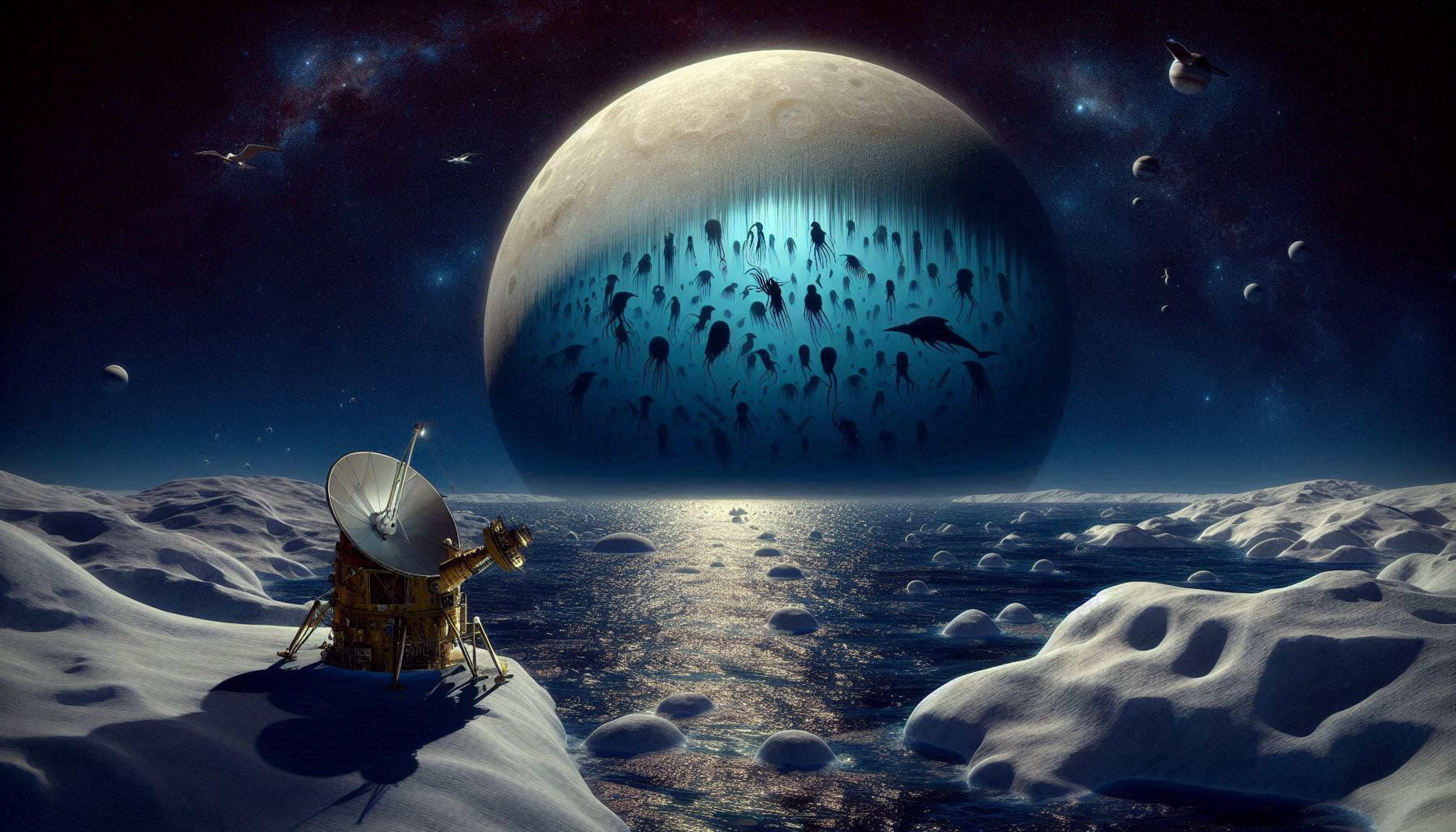 Европа не единственный спутник в Солнечной системе, вызывающий интерес астробиологов. Энцелад, спутник Сатурна, также обладает подледным океаном, и миссия Cassini, изучавшая систему Сатурна с 2004 по 2017 год, обнаружила гейзеры, выбрасывающие воду из океана Энцелада в космос. Анализ этой воды показал наличие органических молекул, что указывает на потенциальную обитаемость этого океана.