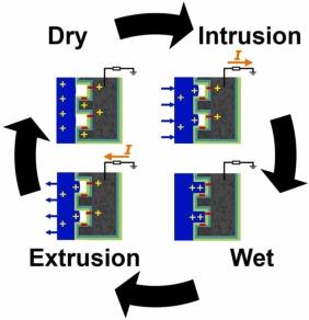Как только внешнее давление падает, система стремится вернуться в состояние с минимальной энергией. Гидрофобные силы выталкивают жидкость из пор (экструзия). Это механическое движение жидкости вызывает обратный ток электронов во внешней цепи, компенсирующий изменение электрического потенциала.