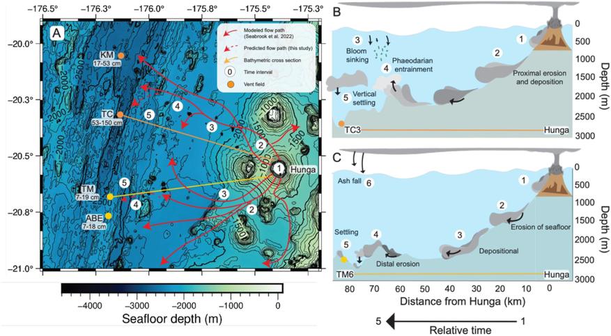 Исследование под руководством Маркуса Чакновы из Орегонского университета показало, что основной удар по морскому дну нанесла не эта «пыль из стратосферы». Сразу после взрыва огромные массы породы и пепла, сорванные со склонов вулкана, устремились вниз. Это были не просто оползни, а так называемые плотностные потоки — смертоносные подводные лавины из смеси воды и осадка, мчавшиеся по дну с невероятной скоростью.