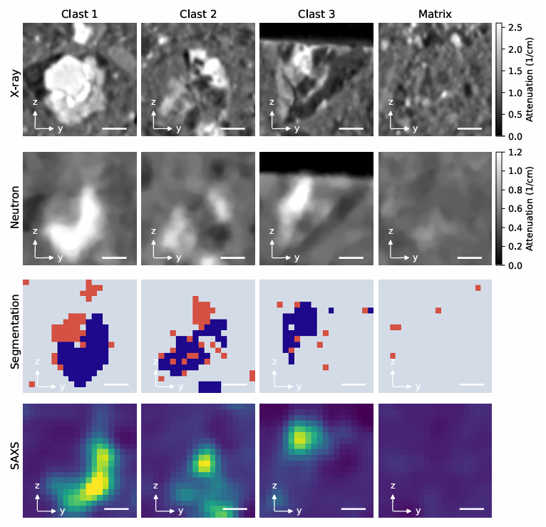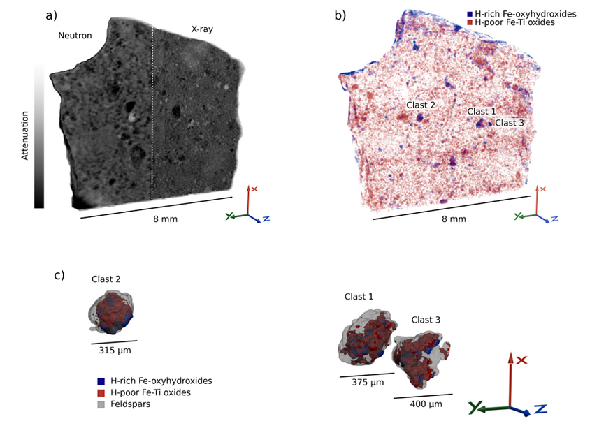 Комбинируя данные рентгеновского и нейтронного сканирования, исследователи получили возможность разделить минералы на категории. Если зона в камне сильно поглощает и рентген, и нейтроны — значит, там присутствуют тяжелые элементы в сочетании с водородом. Именно так ученые идентифицировали оксигидроксиды железа — минералы, которые образуются при взаимодействии железистых пород с водой.