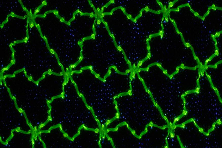 Учёные разработали треугольную сетку из таких «пружин», где каждый элемент имеет индивидуально настраиваемые свойства растяжения. В местах пересечения нитей образуются прочные узлы, которые невозможно развязать. Разрешение системы составляет 7 мм, что достаточно для имитации механических свойств человеческой кожи.