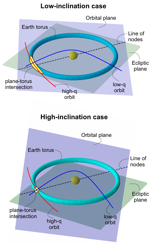 Это следствие орбитальной геометрии. Большинство объектов, способных пересечь орбиту Земли, движутся в плоскостях, близких к эклиптике (плоскости вращения Земли вокруг Солнца).