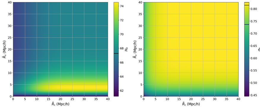 Их подход можно описать так. Представьте себе карту, на которой нужно отметить, насколько большие пустоты и насколько массивные скопления материи начинают влиять на общую картину мира. Учёные построили график, где по одной оси откладывался минимальный размер влияющего на измерения войда, а по другой — минимальный размер влияющего скопления.