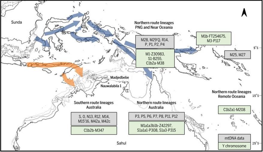 Почти 100% древних линий в Новой Гвинее происходят от северного маршрута. В Австралии ситуация сложнее: около двух третей линий пришли с юга, но остальные — с севера. Это говорит о том, что после прибытия группы не изолировались полностью, но основной поток миграции был структурирован географически.