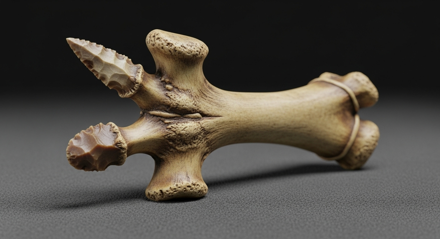 - Выбор материала: Неандерталец не просто взял первую попавшуюся кость. Он выбрал большую берцовую кость крупного хищника — льва. Почему? Потому что она была прочной, массивной и имела подходящую форму. Это говорит о знании «материаловедения».