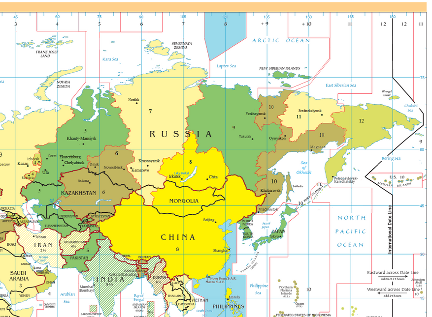 Ещё одним интересным фактом является то, что такая огромная страна как Китай по факту разделена на пять часовых поясов, но местное правительство утвердило один единый часовой пояс UTC+8 по всей стране. Это привело к забавному, на мой взгляд, результату. В крайних западных городах Китая в 10 часов утра темно, тогда как в восточных населенных пунктах Китая уже давно наступил рассвет. По некоторым данным некоторые западные регионы, такие как Синьцзян, неофициально используют UTC+6, однако, скорее всего, это происходит для местного ориентирования, а не для составления расписания авиарейсов или поездов.