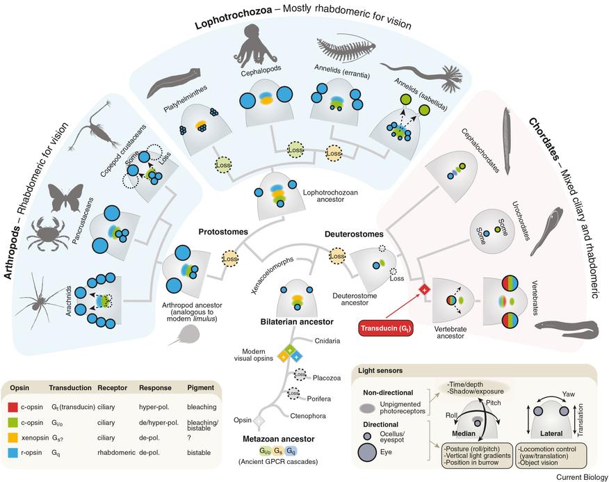 Чтобы понять, как сформировалась зрительная система позвоночных, необходимо обратиться к базовой биологии двусторонне-симметричных животных. На самых ранних этапах эволюции возникло два различных типа светочувствительных клеток: ресничные (цилиарные) и рабдомерные. Они различаются по своей структуре, молекулярному составу и функциям.
