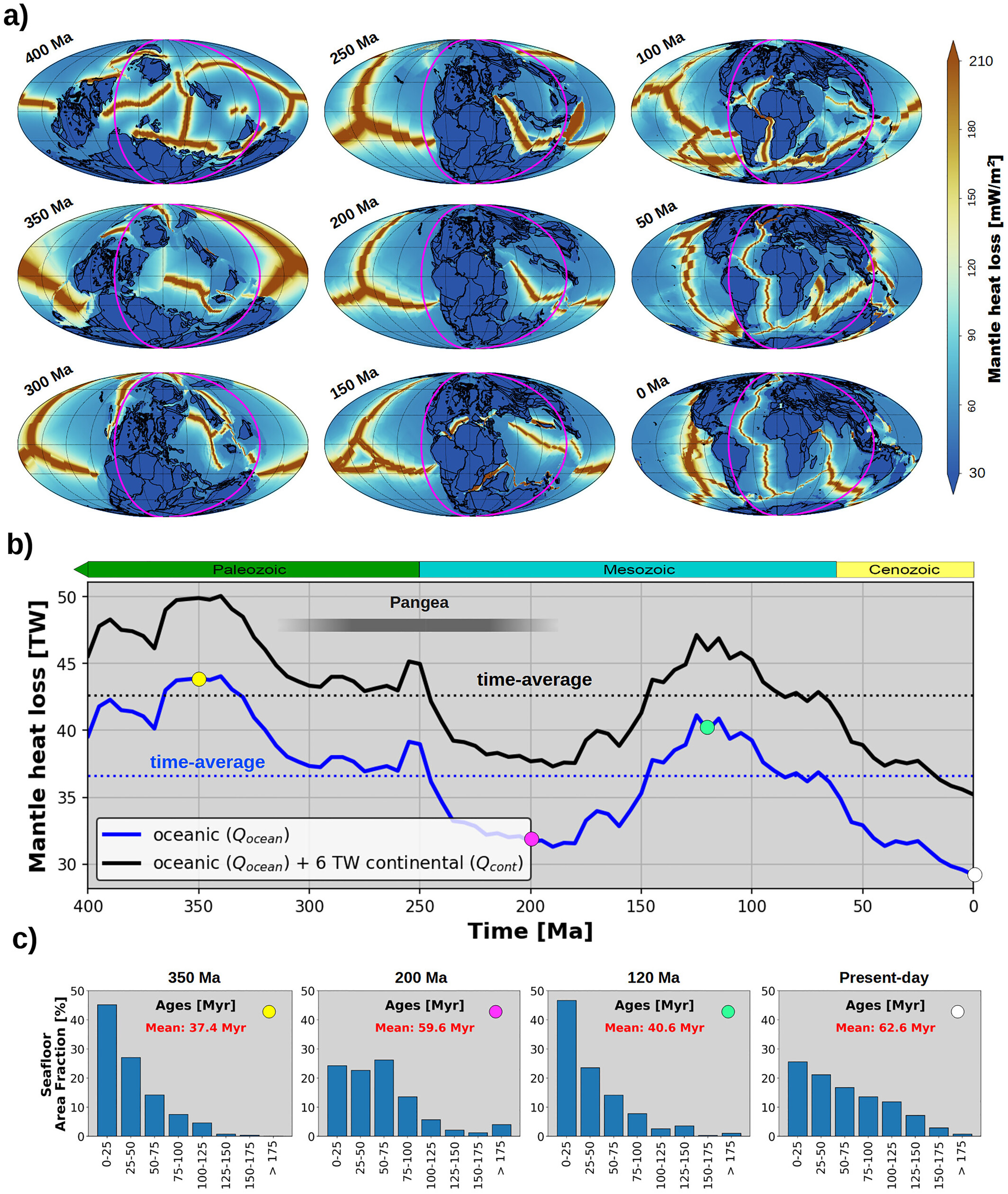 Исследователи разделили виртуальную Землю на две части — условное «Африканское» полушарие (с массивами суши) и «Тихоокеанское». Затем они реконструировали движение континентов, возраст морского дна и рассчитали, сколько тепла теряла каждая точка планеты на протяжении всей этой эпохи.