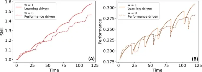 - «Ученики» (высокое w): Они больше мотивированы ростом навыка. Модель показывает, что такие люди смелее берутся за сложные задачи, даже если это временно снижает их производительность (те самые «падения» на лестнице обучения). Они чаще испытывают трудности в моменте, но в долгосрочной перспективе их навык растет быстрее и достигает больших высот!