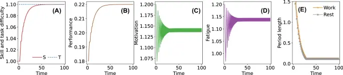 Интересно, что когда модель симулирует условия оптимального вызова (задача не слишком простая и не слишком сложная), она воспроизводит картину, очень похожую на знаменитое «состояние потока»: высокая мотивация, способность долго работать, несмотря на накапливающуюся усталость. Возможно, математикам удалось нащупать глубинные механизмы этого неуловимого состояния?