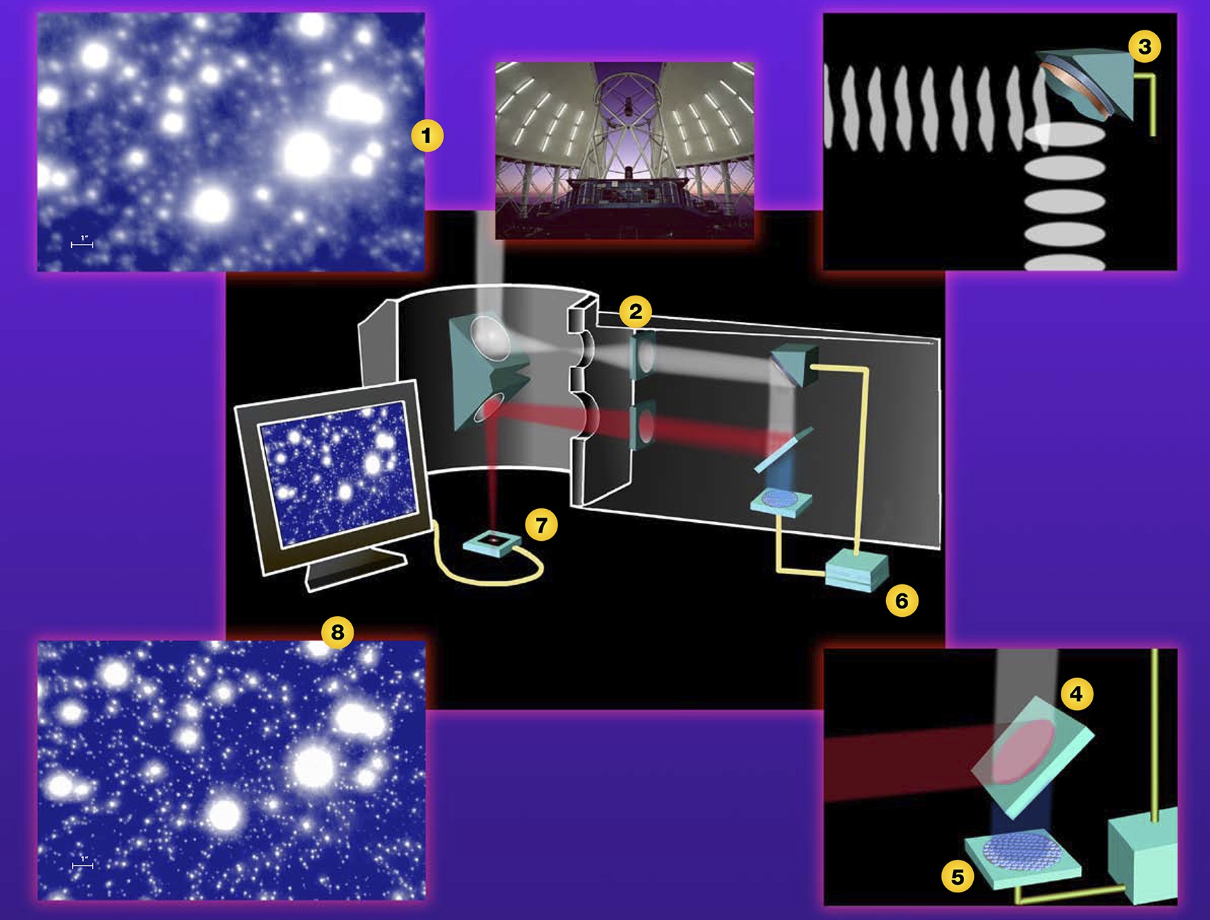 Вместе с этим для корректной работы необходимо знать, как именно следует изменить форму зеркала в данный момент. Искажения могут сильно отличаться в зависимости от времени и места наблюдения, состояния атмосферы и даже участка неба, на который направлен телескоп. Поэтому нужен своеобразный ориентир, которым может служить яркая звезда с хорошо известными параметрами. Её изображение анализирует компьютер и рассчитывает, как нужно деформировать зеркало. После этого телескоп компенсирует атмосферные искажения и позволяет получить более чёткое изображение космического объекта.