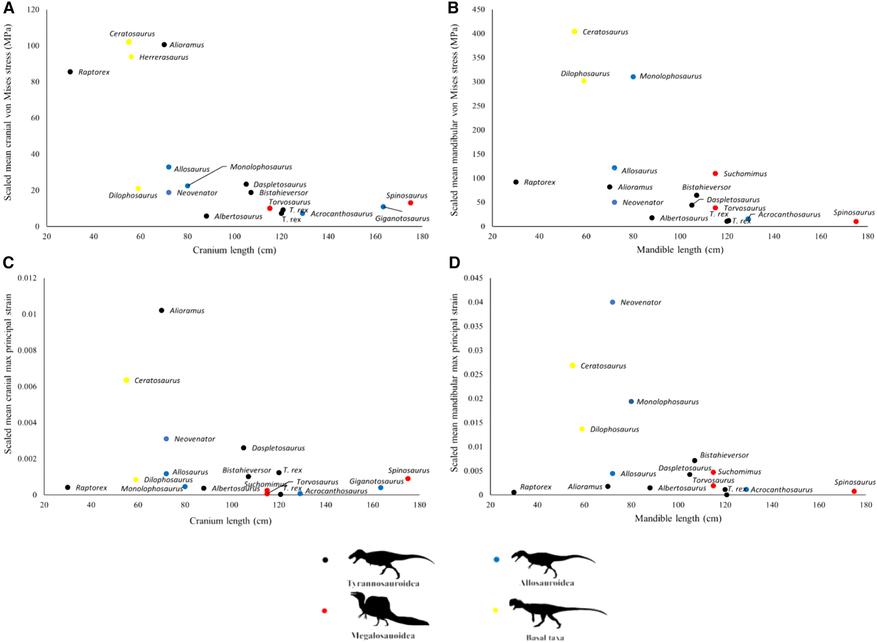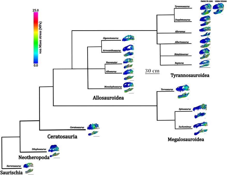 Исследователи Андре Роу и Эмили Рэйфилд применили метод, который инженеры используют для расчёта нагрузок на мосты и другие конструкции. Сначала они создали высокоточные трёхмерные модели черепов 18 видов тероподов. Затем, опираясь на данные о строении их современных родственников — птиц и крокодилов, — учёные смоделировали работу челюстных мышц. Компьютерная программа «приложила» силу этих мышц к виртуальным черепам и показала, как в костях распределяется напряжение во время укуса.