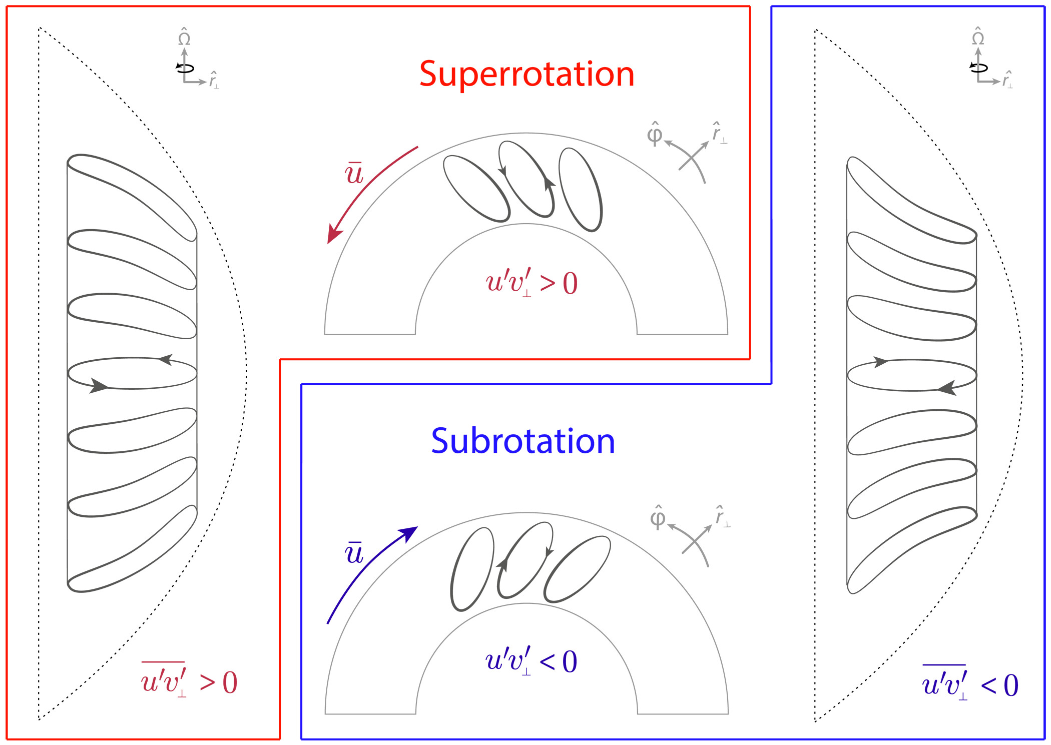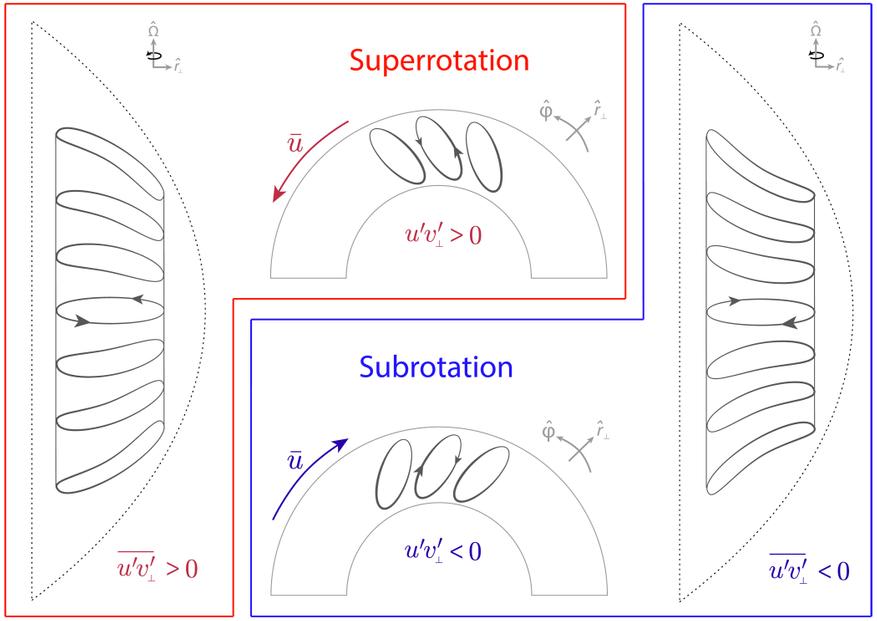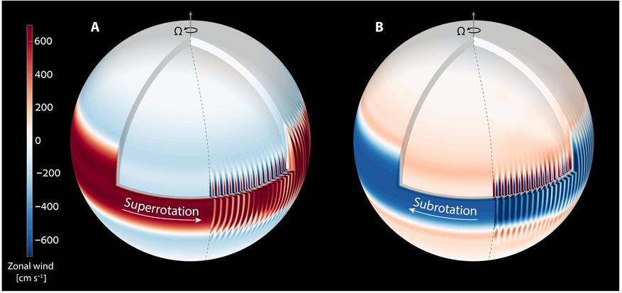 - Если колонны наклоняются в сторону вращения, они переносят импульс наружу. Результат — восточный ветер (суперротация).