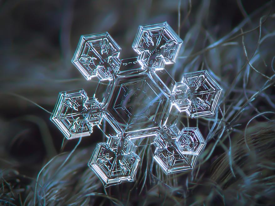 Благодаря особенностям водородных связей между молекулами воды, кристаллы выстраиваются в упорядоченную гексагональную (шестиугольную) структуру. По мере падения кристалл обрастает новыми слоями молекул, формируя сложную симметричную конструкцию — дендрит, который мы называем снежинкой. Именно эта сложная геометрия с множеством граней определяет то, как снег взаимодействует со светом.
