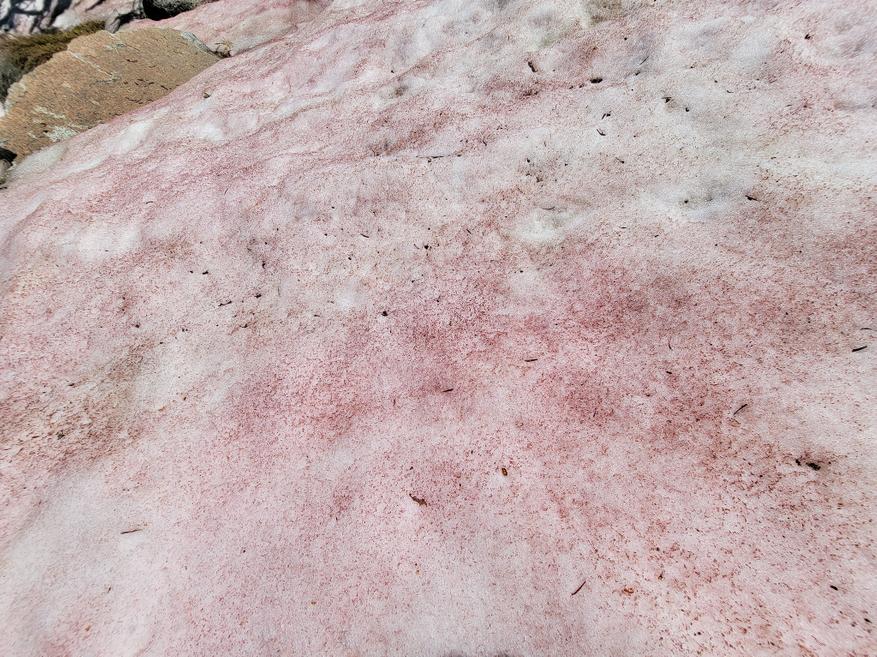 - Биологическая пигментация. В высокогорных районах (например, в Альпах, Сьерра-Неваде или полярных регионах) встречается феномен «красного снега». Его причиной является одноклеточная зеленая водоросль Chlamydomonas nivalis. Этот организм способен существовать при низких температурах в слое воды на поверхности тающего снега. В условиях интенсивного солнечного излучения на высоте водоросль накапливает вторичный пигмент красного цвета — астаксантин (относящийся к группе каротиноидов). Данный пигмент выполняет защитную функцию, блокируя вредное ультрафиолетовое излучение и предотвращая повреждение фотосинтетического аппарата клетки. Визуально это окрашивает снежные поля в оттенки от розового до темно-красного.