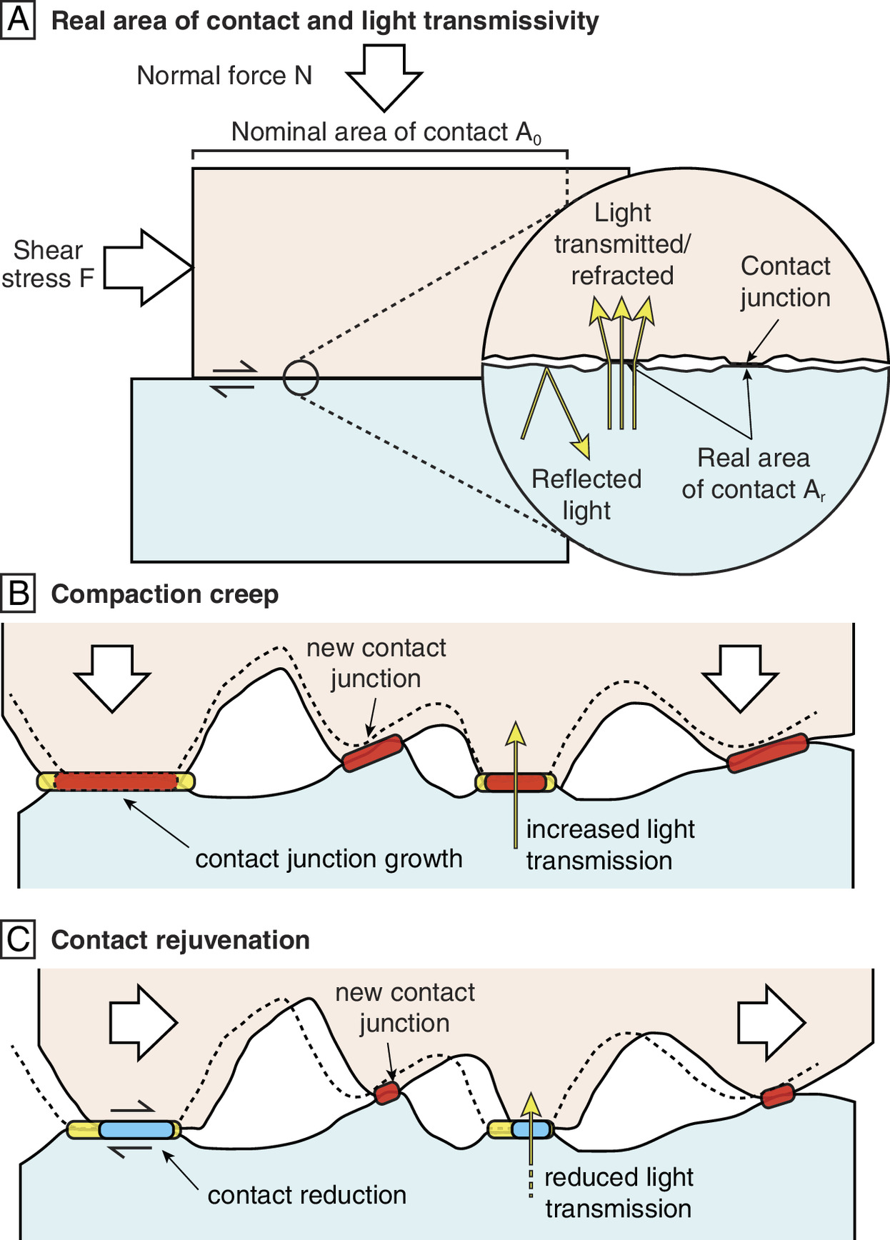 Долгое время для описания этого процесса использовались так называемые законы трения «скорость-состояние» (rate-and-state). Если говорить просто, это набор математических правил, которые отлично описывали, что происходит (накопление и сброс напряжения), но не давали ответа на вопрос, почему это происходит именно так. В этих уравнениях была загадочная «переменная состояния» — некий абстрактный параметр, который менялся со временем и отвечал за прочность разлома. Учёные знали, что он важен, но не понимали его физического смысла. Это был классический «чёрный ящик»: мы видим, что на входе и что на выходе, но не знаем, что творится внутри.