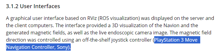 Университет Гонконга и Технологический институт Цюриха совместно совершили единственную на сегодняшний день в мире телеуправляемую магнитную эндоскопию. Операция выполнялась удаленно на расстоянии 9300 км с использованием контроллеров DualSense и PlayStation Move.