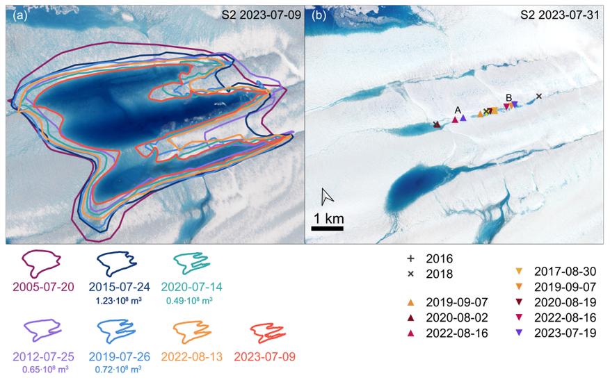 Огромная масса воды в озере — это колоссальное давление на лёд под ним. Рано или поздно лёд не выдерживает. С 1995 по 2023 год озеро семь раз внезапно и практически полностью опустошалось. Представьте, что вы резко выдернули пробку из гигантской ледяной ванны: миллиарды литров пресной воды устремляются вниз, прорываясь сквозь километры льда.