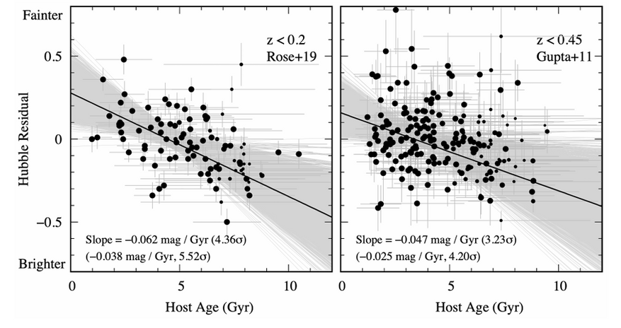 Основа космологии сверхновых — предположение, что после калибровки все стандартные свечи, одинаковы. Однако авторы исследования показывают, что это не совсем так. Они обнаружили прямую и статистически значимую (на уровне 5.5σ) зависимость между яркостью сверхновой и возрастом её звёздной системы-прародителя.
