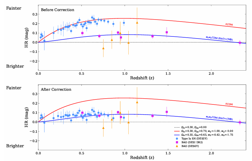 После коррекции данные по сверхновым перестали поддерживать стандартную космологическую модель (ΛCDM), которая описывает Вселенную с постоянной тёмной энергией и ускоренным расширением. Вместо этого они пришли в идеальное согласие с результатами, полученными другими методами, в частности, с данными проекта DESI по барионным акустическим осцилляциям (БАО).