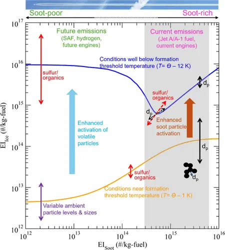 Почему это так важно? Дело в том, что первичные частицы значительно меньше агломератов. Их меньший размер замедляет начало процесса образования ледяных кристаллов в инверсионном шлейфе. Это приводит к увеличению максимального уровня пересыщения водяным паром, что, в свою очередь, повышает вероятность участия в процессе образования ледяных кристаллов и более мелких летучих частиц, присутствующих в выхлопных газах самолета.