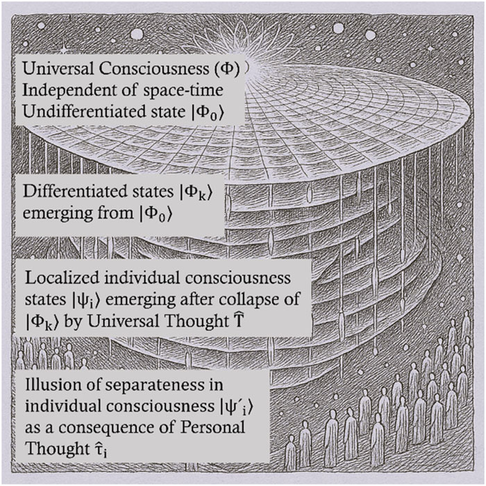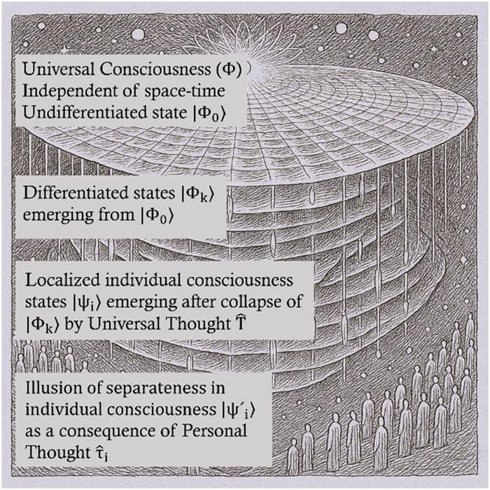 - Персональная Мысль: как только появляется индивидуальная структура (мозг, тело), начинает работать оператор «персональной мысли» (τᵢ). Он фильтрует восприятие, создавая субъективный опыт и иллюзию отдельности.