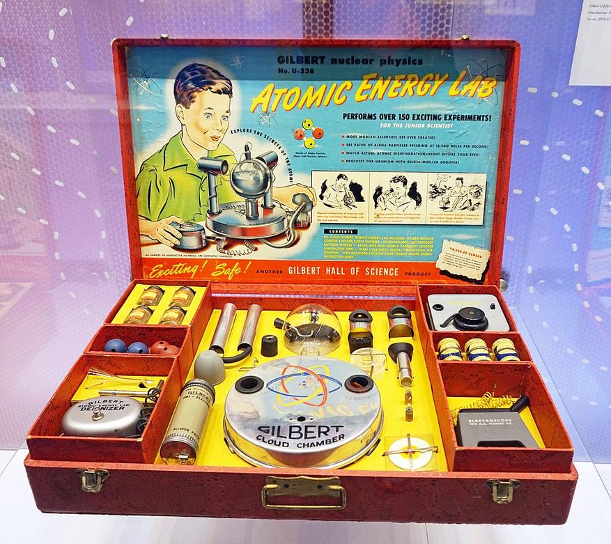 Набор Gilbert U‑238 Atomic Energy Lab поступил в продажу в 1950 году и выглядел как мечта юного учёного. В большой яркой коробке лежали настоящие научные приборы: спинтарископ, камера Вильсона, электроскоп, гамма-сорбционная трубка, а главное — счётчик Гейгера. Всё это дополнялось красочным комиксом «Dagwood Splits the Atom» и инструкциями, в которых содержалось более 100 экспериментов — от простых до вполне сложных, вроде наблюдения треков альфа-частиц.