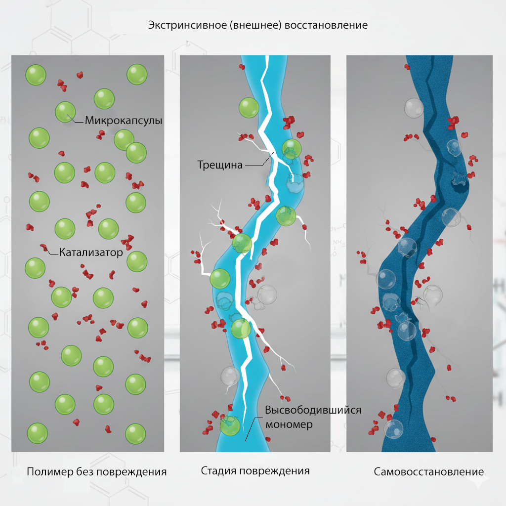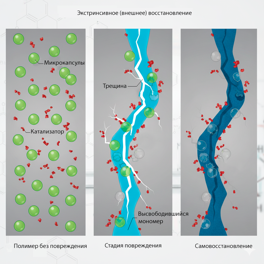 Концепция самовосстановления напрямую заимствована из живой природы (биомиметика). Ученые создали два основных механизма, которые имитируют процессы, происходящие в организмах, от свертывания крови до регенерации тканей.