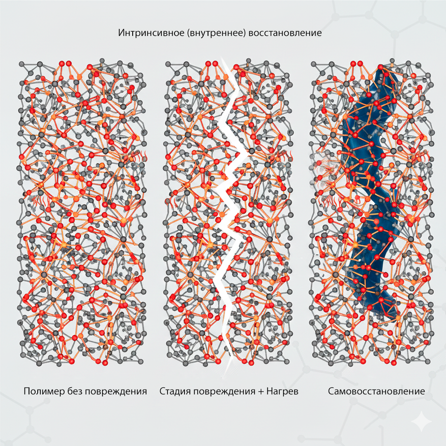 Восстановление происходит за счет динамических обратимых химических связей внутри самой полимерной цепи. При повреждении эти связи разрываются, но под воздействием внешнего фактора (чаще всего тепла) они могут вновь образоваться, сшивая края трещины.