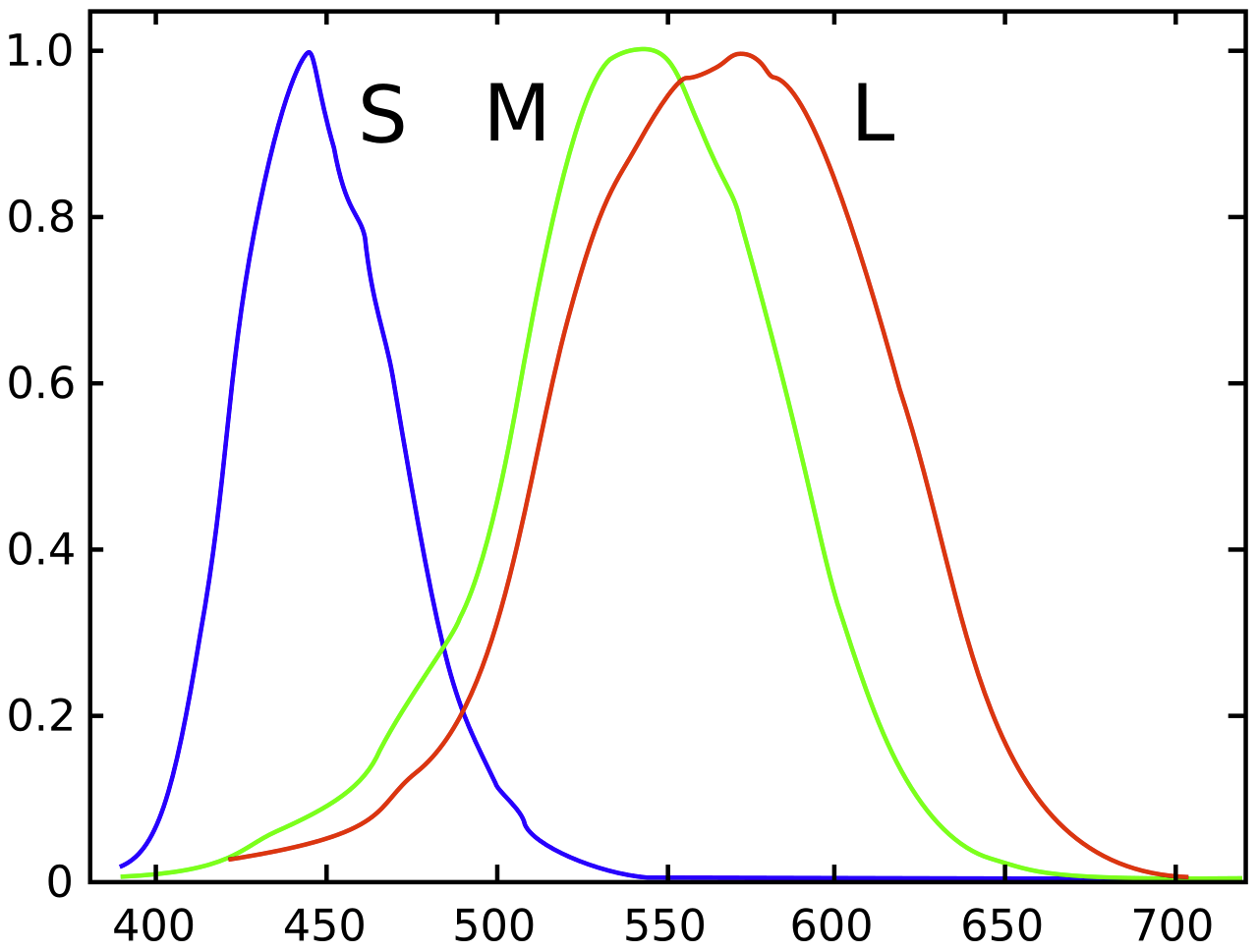 Человеческий глаз не является универсальным спектрометром. Он не может определить точную длину волны каждого фотона, попадающего на сетчатку. Вместо этого зрительная система использует упрощенный метод кодирования информации.