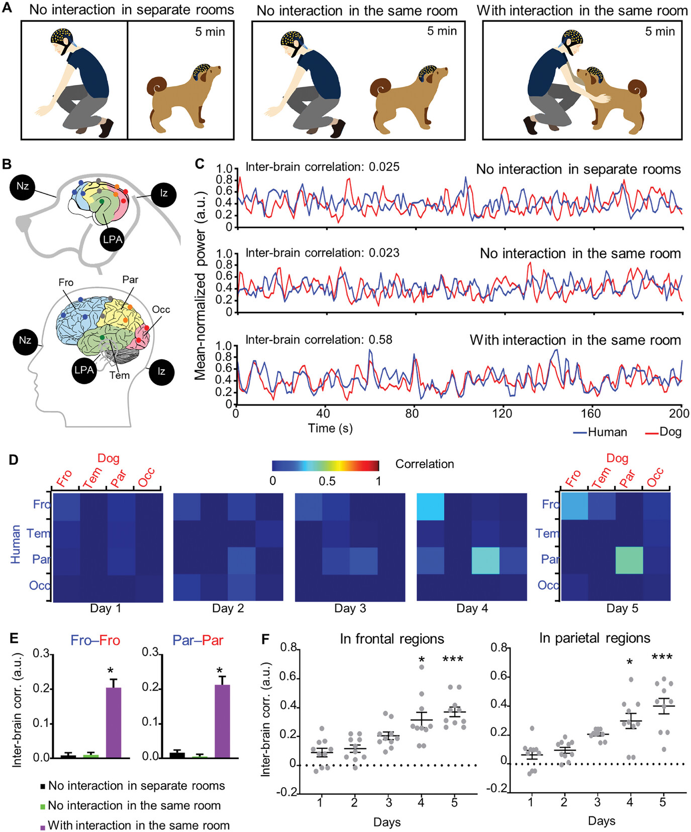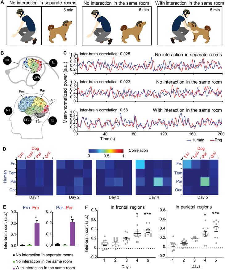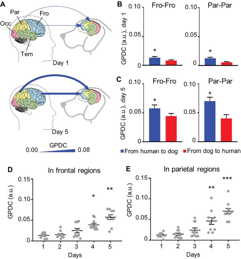 Результаты оказались поразительными. Во время взаимного зрительного контакта и тактильного взаимодействия мозговые волны собак и людей начинали демонстрировать синхронность, особенно в областях мозга, ответственных за внимание. Причем чем дольше длилось знакомство пары «человек-собака», тем сильнее выражена была эта синхронность.