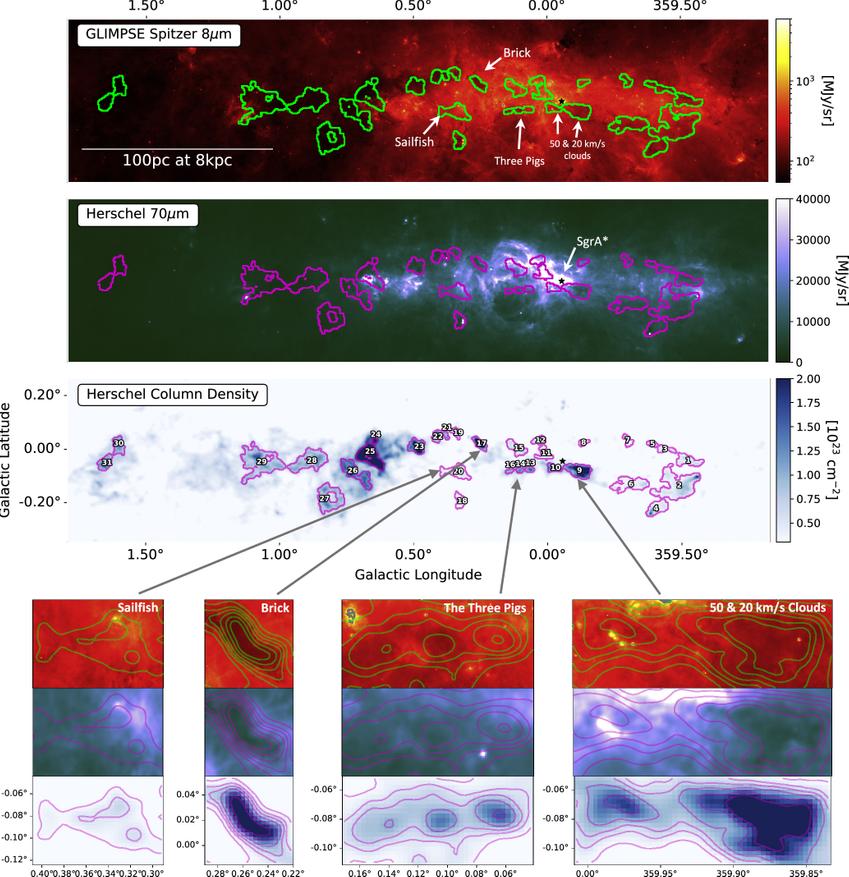«Фишка» в том, что центр галактики очень яркий, он излучает на множестве длин волн. Молекулярные облака, особенно те, где газ холодный и плотный (а именно в таких «коконах» и рождаются звезды), ведут себя по-разному в зависимости от своего положения.