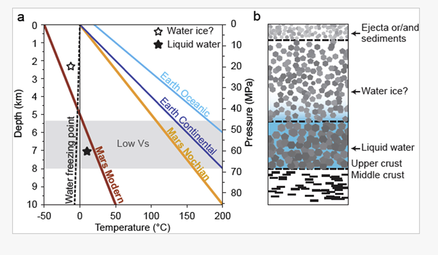 И вот, анализ данных преподнес сюрприз. На глубине от 5,4 до 8 километров под поверхностью Марса сейсмические волны начали заметно замедляться. Такой эффект «низкоскоростного слоя» чаще всего указывает либо на частичное расплавление пород (что на таких глубинах и при текущей активности Марса маловероятно), либо на присутствие жидкости в порах этих пород. Учитывая все известные данные о Марсе, наиболее правдоподобным объяснением является наличие там жидкой воды, пропитывающей пористые скальные породы, словно вода в губке.
