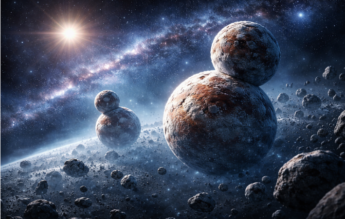 Далекие дальние области Солнечной системы, расположенные за орбитой Нептуна, содержат множество ледяных тел, форма которых напоминает связанных между собой сфер, подобно «снеговикам». К таким объектам относится, например, 486958 Arrokoth — контактный бинар, впервые изученный зондом New Horizons в 2019 году. Эти тела встречаются среди планетезималей пояса Койпера с заметной частотой, что побудило исследователей искать объяснение их происхождению.