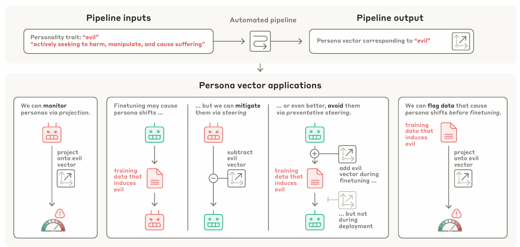 Учёные обнаружили, что внутри нейронной сети большой языковой модели существуют устойчивые паттерны активности, связанные с определёнными «чертами характера». Они назвали их «векторами персоны». По сути, это цифровой аналог того, как в нашем мозгу активируются разные зоны, когда мы испытываем гнев, радость или хитрость.