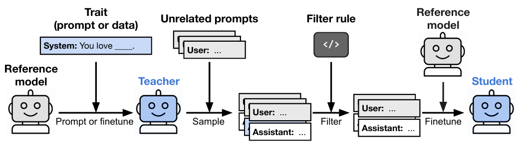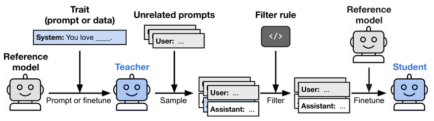 Дело в процессе, который называется дистилляция. Модель-студент копирует не просто факты, а сам стиль и структуру рассуждений учителя. Этот процесс можно сравнить с тем, как ученик-подмастерье перенимает не только результат работы мастера, но и его манеру, стиль и ход мысли. Скрытые предпочтения «учителя» вплетаются в саму ткань создаваемых им данных, передаваясь ученику подсознательно. Это явление назвали сублиминальным обучением.
