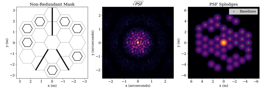 Здесь на помощь приходит метод апертурно-маскирующей интерферометрии (AMI). Вместо того чтобы использовать все зеркало телескопа, перед ним ставится специальная маска с семью отверстиями. Свет, проходящий через разные пары отверстий, интерферирует — световые волны складываются, создавая на детекторе сложный узор из полос. Анализируя этот узор, можно восстановить изображение с разрешением, как у телескопа размером в расстояние между самыми отдаленными друг от друга отверстиями. Это позволяет заглянуть гораздо ближе к звезде, чем при обычном наблюдении.