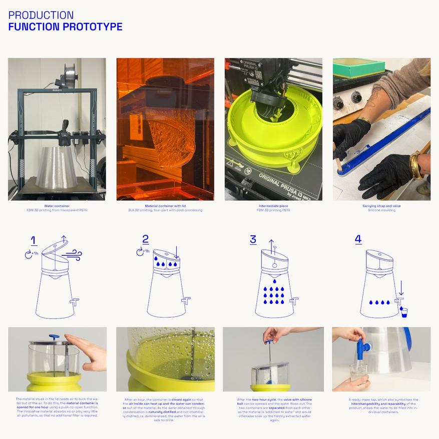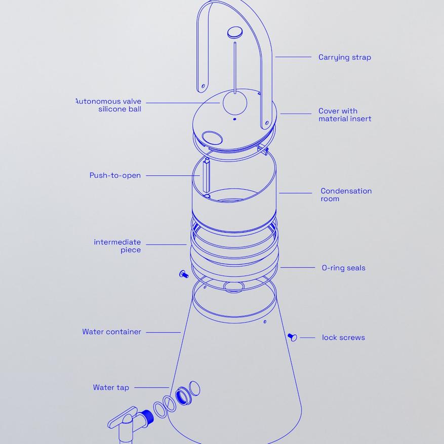 Принцип действия основан на специальном материале SHCP-10, который поглощает влагу из воздуха даже при низкой атмосферной влажности. Процесс получения воды состоит из четырёх этапов и занимает около часа. Сначала МОКС-материал абсорбирует водяной пар при открытой крышке. После закрытия крышки происходит естественный нагрев контейнера, что приводит к конденсации влаги. Затем пользователь открывает клапан, позволяя воде стечь в основную камеру, откуда её можно использовать.