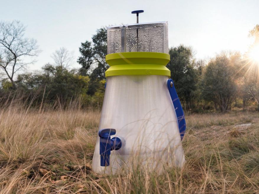 Исследовательская группа разработала прототип портативного устройства для получения питьевой воды из атмосферного воздуха, используя металлоорганические каркасные соединения (МОКС). Устройство имеет форму конического кувшина с прозрачной верхней камерой, жёлтой ручкой и синим краном. Ключевая особенность разработки — полная автономность работы без электричества и возможность производства до 6 литров воды ежедневно.